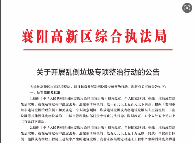 襄陽高新區(qū)發(fā)布 《關(guān)于亂倒垃圾專項整治行動的公告》即日執(zhí)行