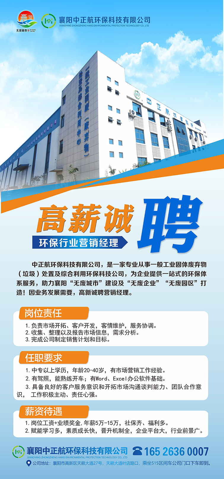 中正航環(huán)??萍加邢薰?,是一家專業(yè)從事一般工業(yè)固體廢棄物(垃圾)處置及綜合利用環(huán)??萍脊?,為企業(yè)提供一站式的環(huán)保體系服務(wù),助力襄陽“無廢城市”建設(shè)及“無廢企業(yè)”“無廢園區(qū)”打造!因業(yè)務(wù)發(fā)展需要,高薪